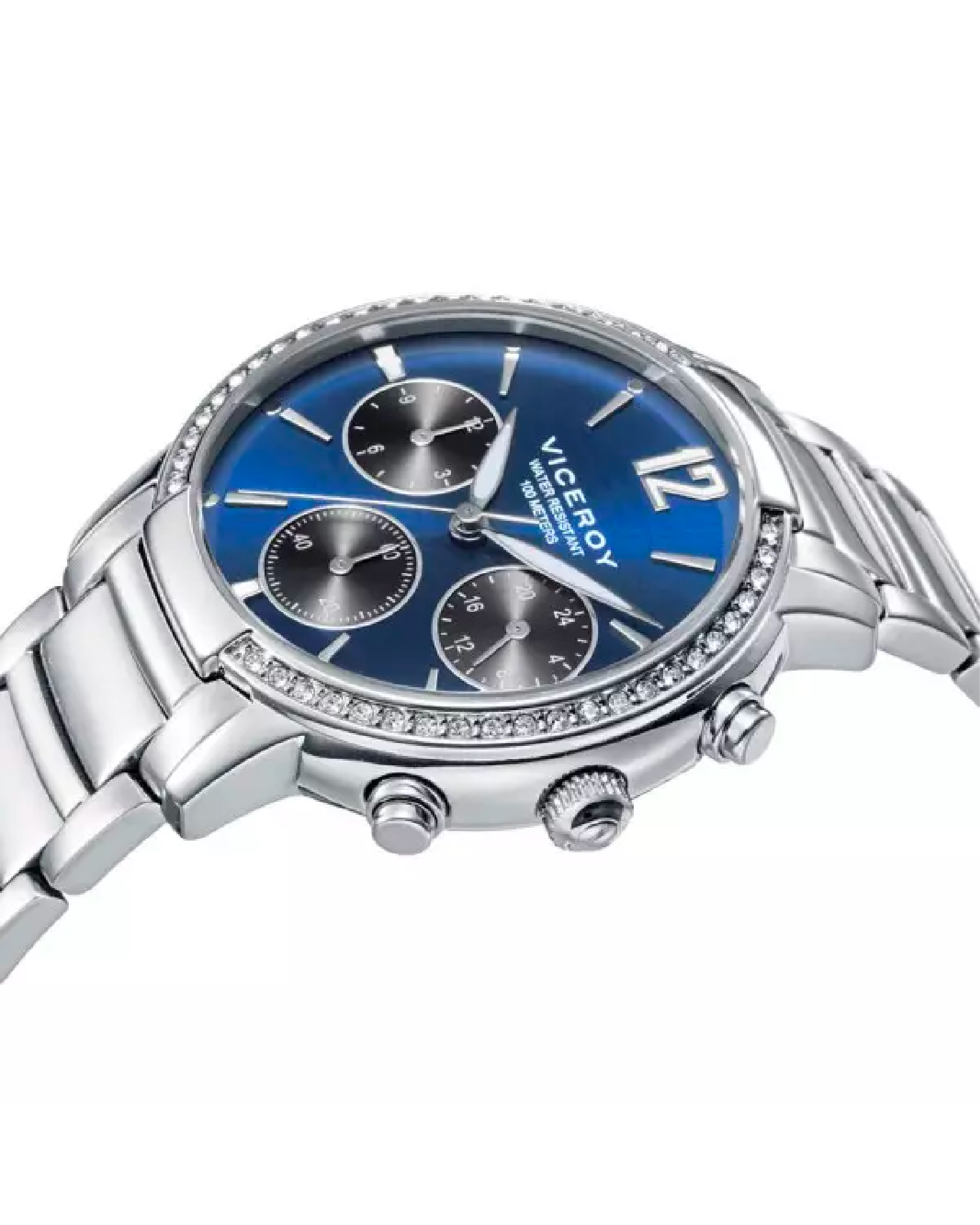 Reloj Viceroy 401208-35 para mujer, Colección Laura Escanes esfera azul con el cristal óptico mineral, tres agujas multifunciones, caja de acero inoxidable de 38 mm. de diámetro con circonitas, cadena de acero con cierre oculto desplegable.